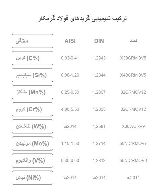 3.فولادهای پایه مولیبدن (Molybdenum-based): مولیبدن باعث بهبود ساختار ریزدانه، افزایش مقاومت حرارتی و افزایش سختی در دماهای بالا میشود.گریدهای H42 و همچنین گریدهایی مانند 1.2344، 1.2767، 1.2714، 1.2365، 1.2367 در این دسته قرار میگیرند.