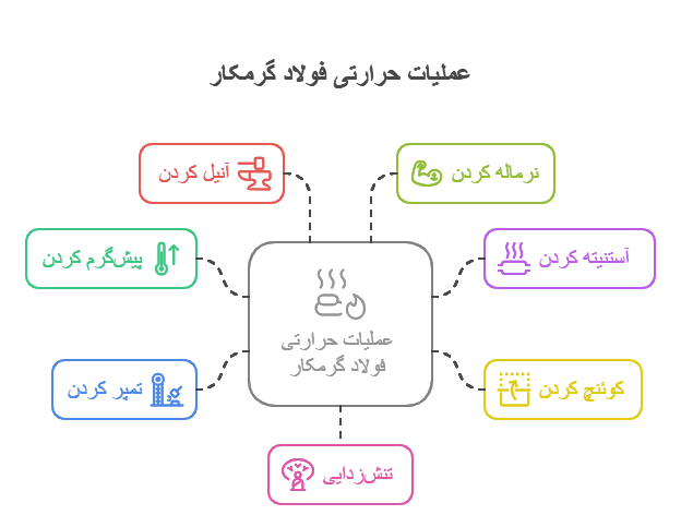 برای دستیابی به حداکثر خواص مانند سختی، استحکام، چقرمگی و مقاومت به سایش، فولادهای گرمکار باید تحت عملیات حرارتی مناسب قرار گیرند37. انجام عملیات حرارتی در محیط خلاء مزایایی مانند جلوگیری از دکربوره شدن و اکسیداسیون سطح را دارد38. برخی از مهمترین فرآیندهای عملیات حرارتی عبارتند از: